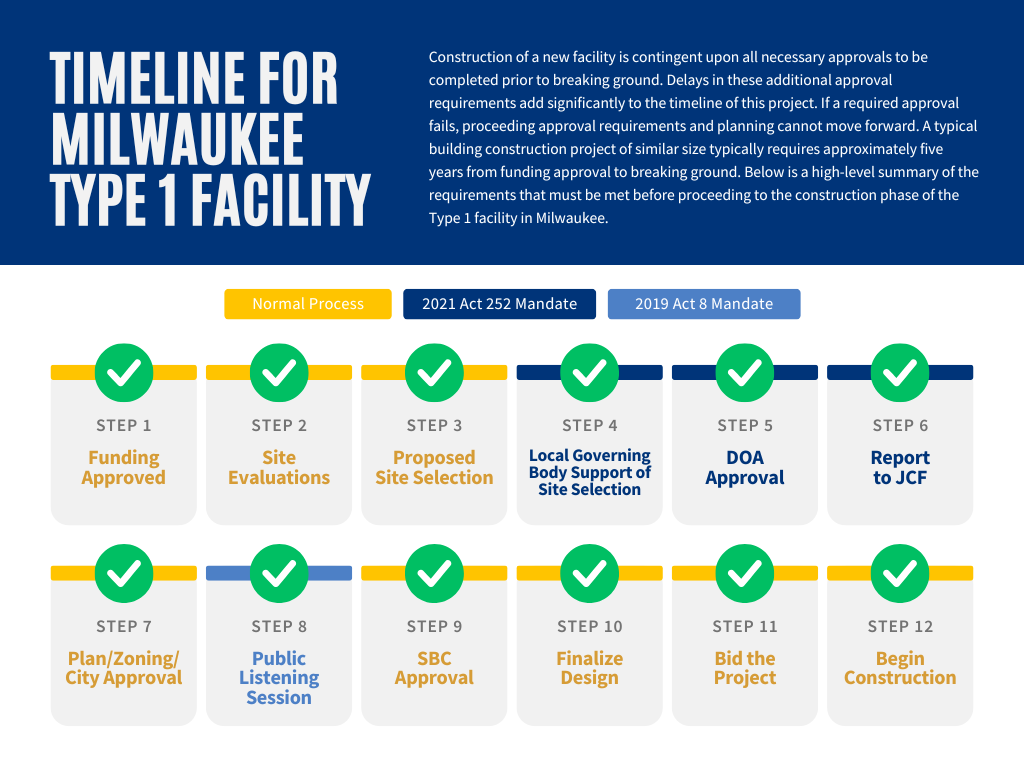 Since the passage of 2017 Act 185, other laws have passed that have mandated additional steps prior to the construction of a new Type 1 Facility. These additional requirements also interact with the State of Wisconsin's established process for new construction. The State's established process for new construction projects includes a formal process for siting, planning, and building new construction that involves oversight by the Department of Administration (DOA), through the State Building Commission (SBC). 2019 Act 8 and 2021 Act 252 included additional approval requirements for the construction of a new Type 1 facility. Construction of a new facility is contingent upon all of these necessary approvals being completed prior to breaking ground. Delays in these additional approval requirements add significantly to the timeline of this project. If a required approval fails, proceeding approval requirements and planning cannot move forward. A normal building construction project of similar size typically requires approximately five years from funding approval to breaking ground.